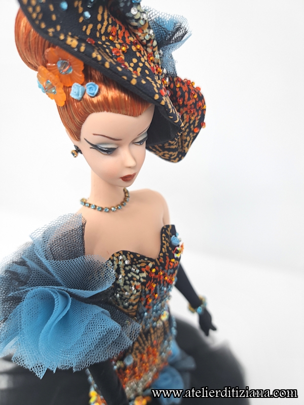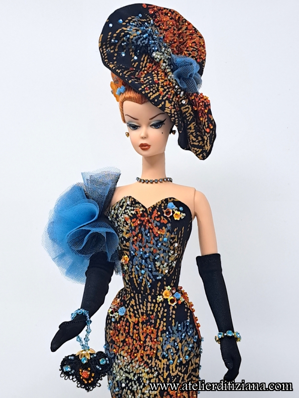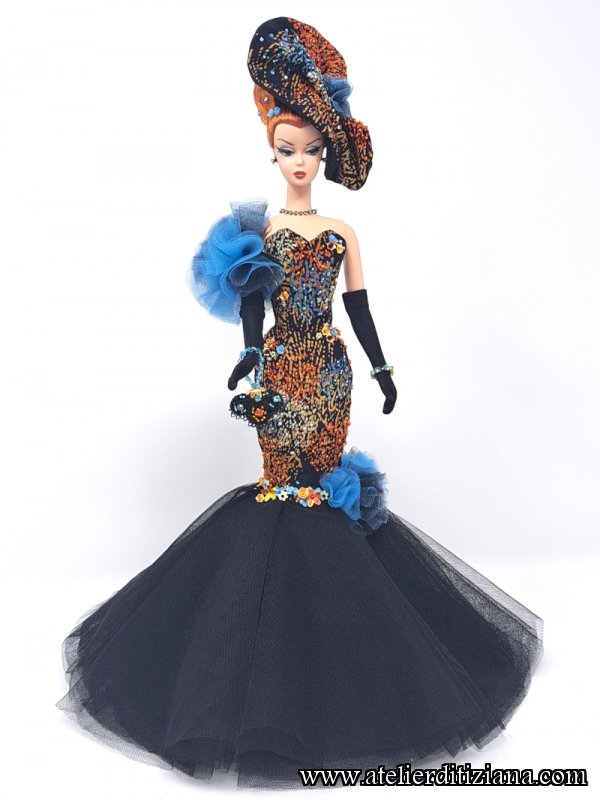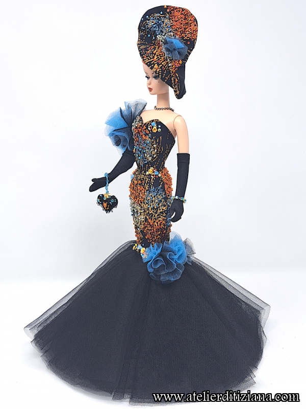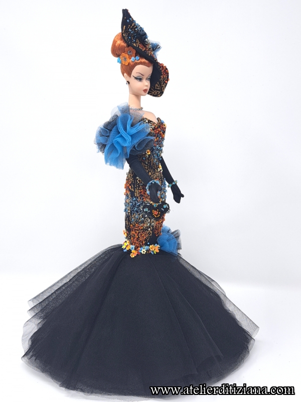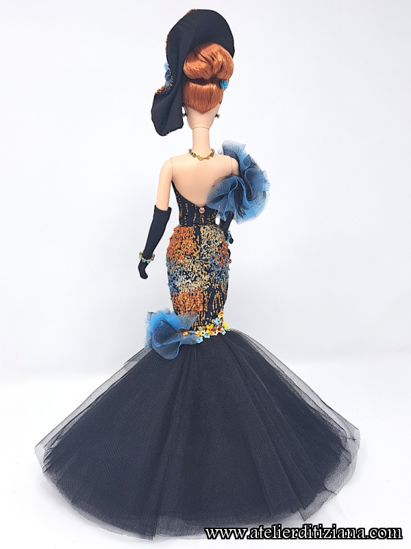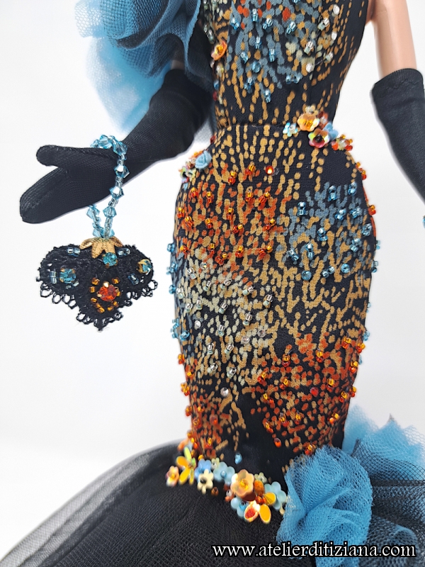 Both the skirt and the bodice are embroidered by hand with beads, sequins, rocailles and Swarovski rhinestones.